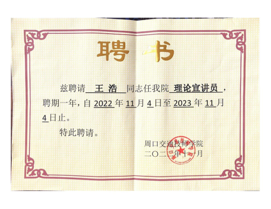 經過激烈的角逐,王浩教師榮任周口交通技師學院馬克思主義學院理論宣講員,并頒發宣講員聘書!