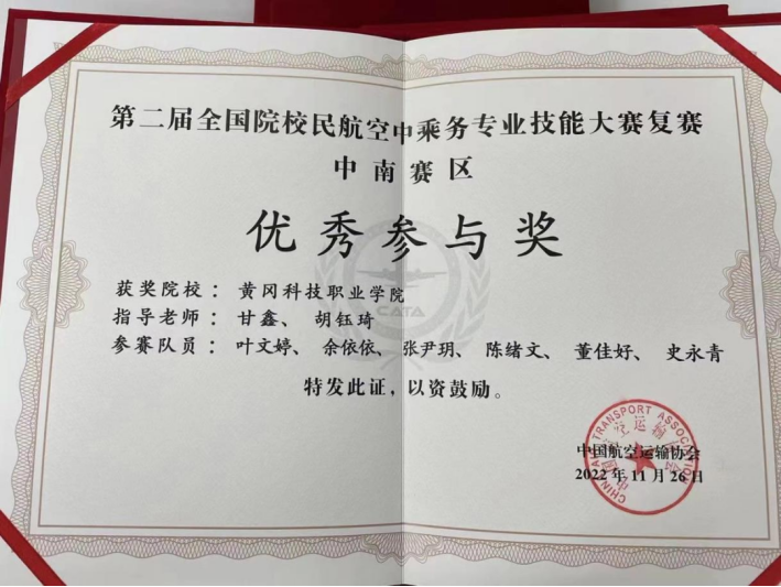 11月26日,第二屆全國院校民航空中乘務專業技能大賽中南區復賽在滁州·華東航空實訓基地圓滿落幕,因疫情原因,黃岡科技職業學院校區旅游與航空服務學院民航空中乘務專業的學生未能線下參加,只能通過有限的條件參加線上比拼,最終獲得優秀獎。